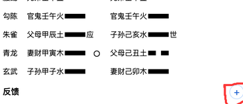 一、进入排盘详细页,点击卦像下部反馈区域右侧的“+”号图标,展开反馈编辑和图片上传、金融代码输入界面。